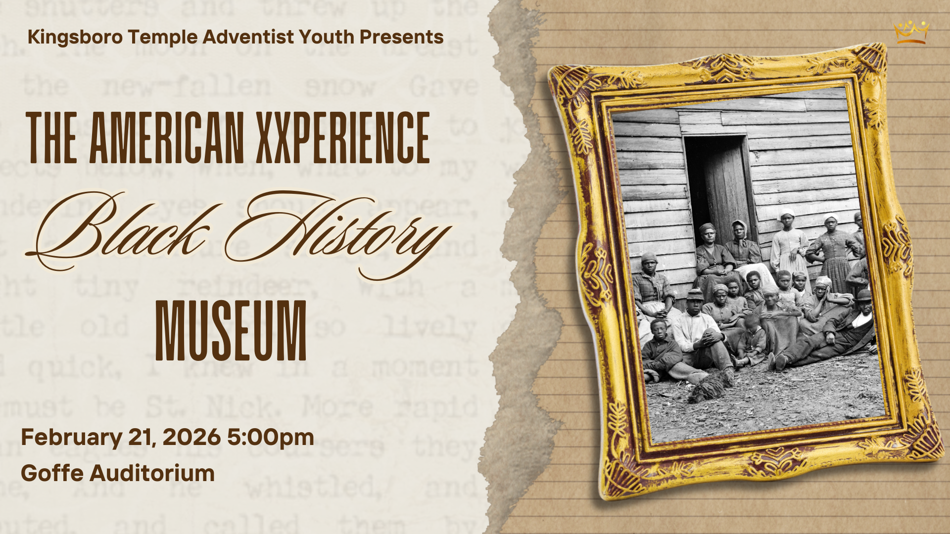 BLACK HISTORY MONTH - THE AMERICAN XXPERIENCE Saturday, February 21, 2026 5:00 PM 7:00 PM Kingsboro Temple SDA 415 7th Street Brooklyn, NY, 11215 United States (map) Google Calendar ICS Join us on February 21st at 5 PM, when Goffe Auditorium will be transformed into an interactive museum of hope, inviting you to walk through stories of resilience, triumph, and divine inspiration.